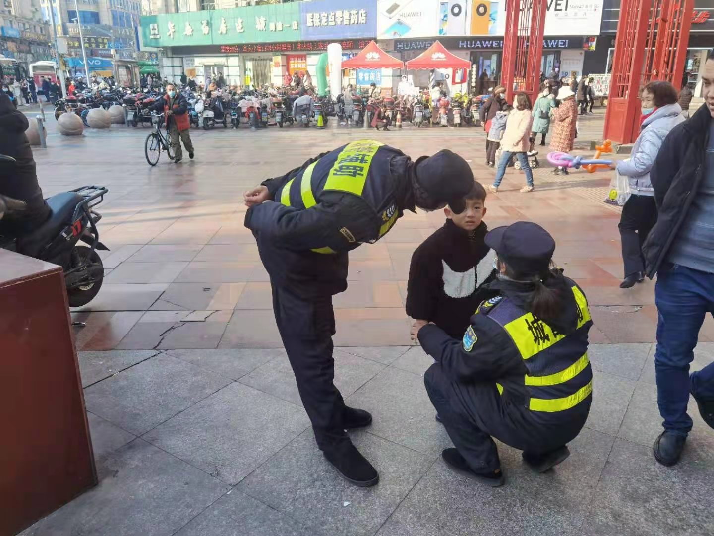 1月2日,宗保公司駐周浦市容項目隊員曹秋霞幫助走散男童找到家人。