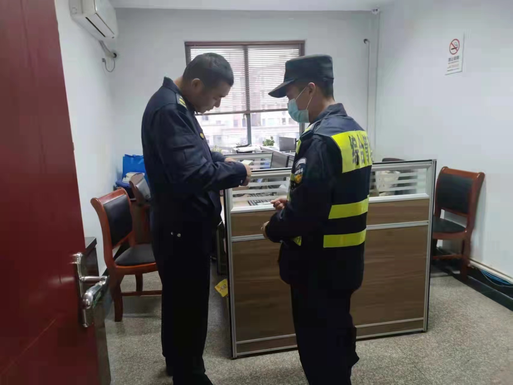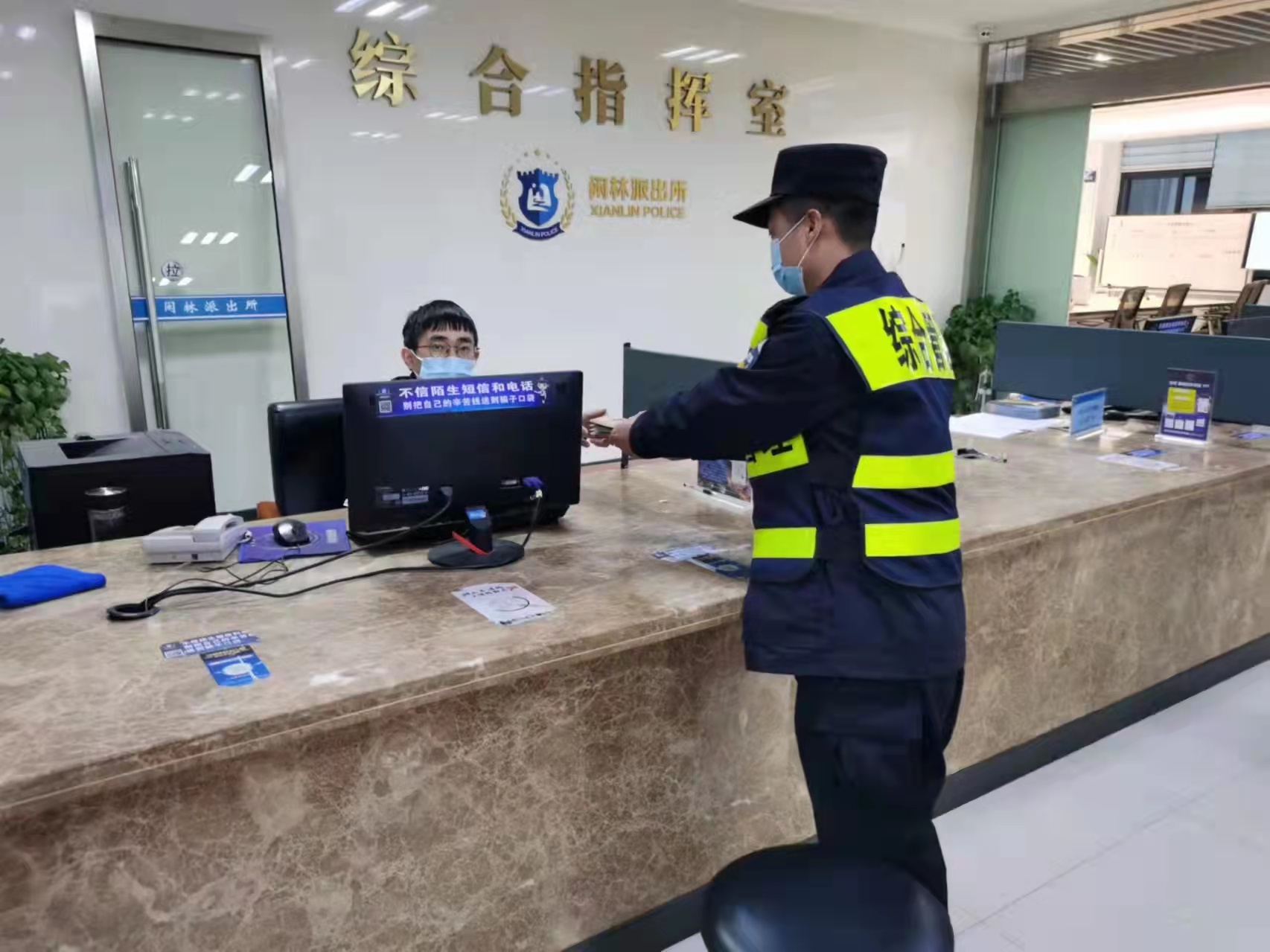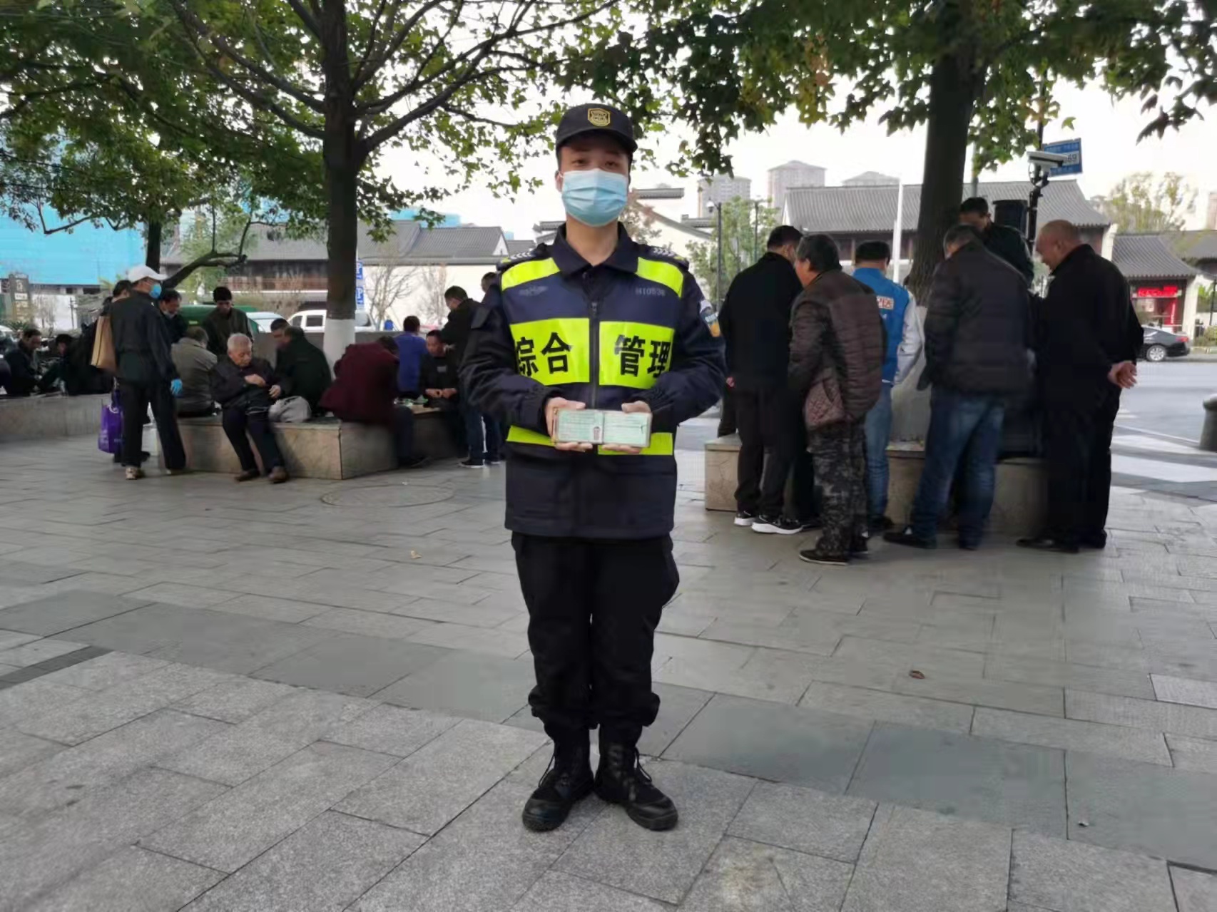 11月12日,浙江民泰駐閑林城管輔助項目隊員撿到皮包上交民警,幫尋失主。