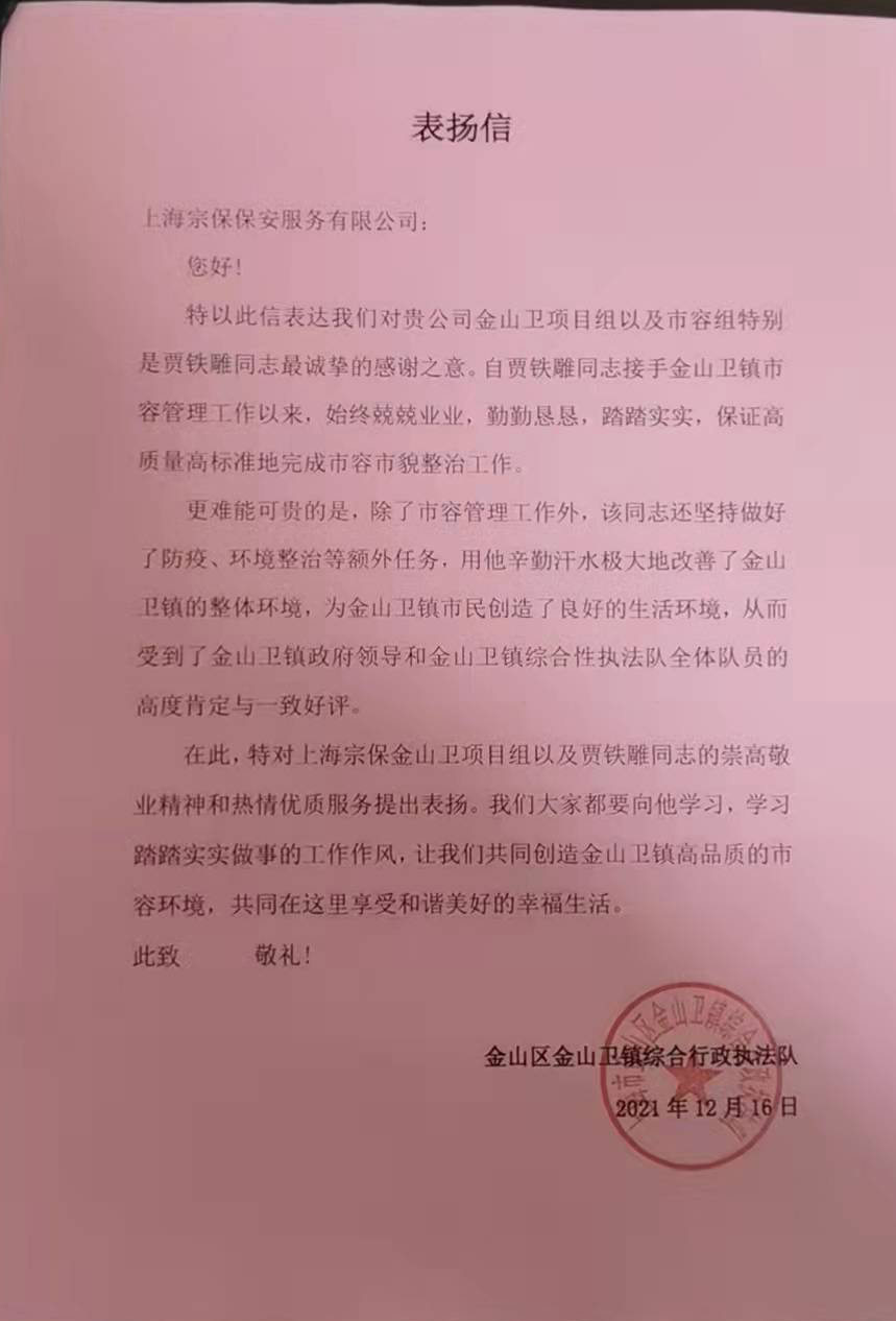 12月16日,宗保公司駐金山衛市容項目收到金山衛鎮綜合行政執法隊的表?yè)P信,信中對宗保隊員賈鐵雕兢兢業(yè)業(yè)的工作表現提出特別表?yè)P。
