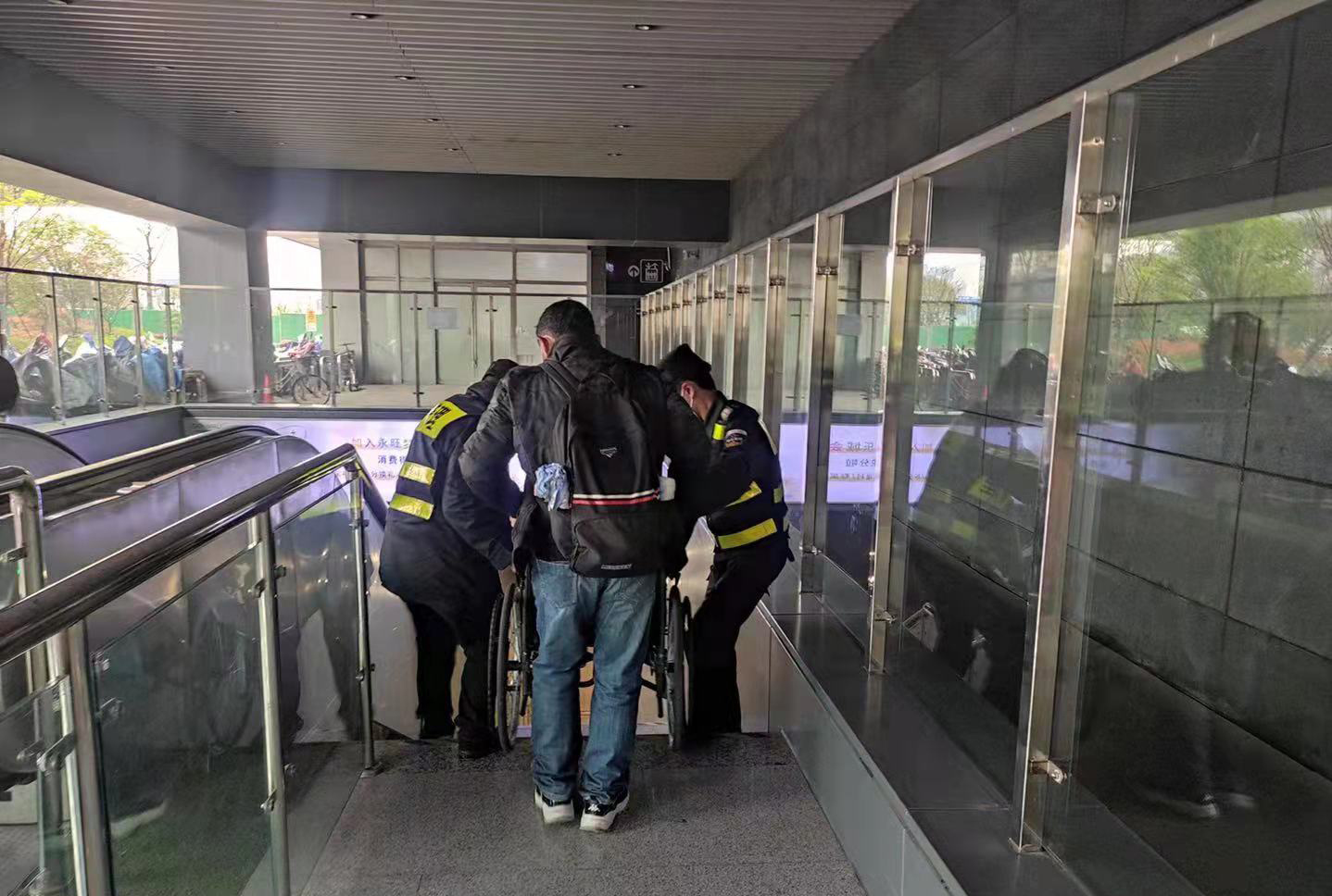 當日10:20,張彬洋和樊粵強在地鐵2號線(xiàn)杜甫村站值勤時(shí),看見(jiàn)有位老人推著(zhù)輪椅,輪椅上還坐著(zhù)一位老人,在地鐵出入口駐足觀(guān)望,徘徊不前。見(jiàn)此情形,兩位隊員立即上前詢(xún)問(wèn)是否需要幫助。