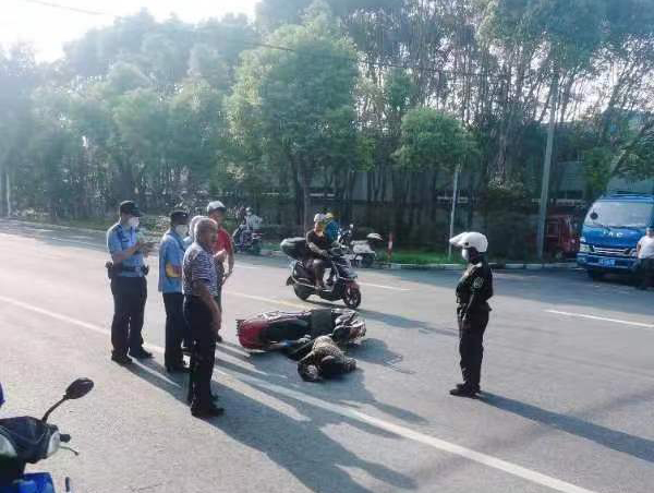當日16:01,龍鳳嬌在科工路附近巡邏時(shí),看到一位老人躺在馬路中間,一輛電瓶車(chē)倒在一旁,就趕緊上前察看。