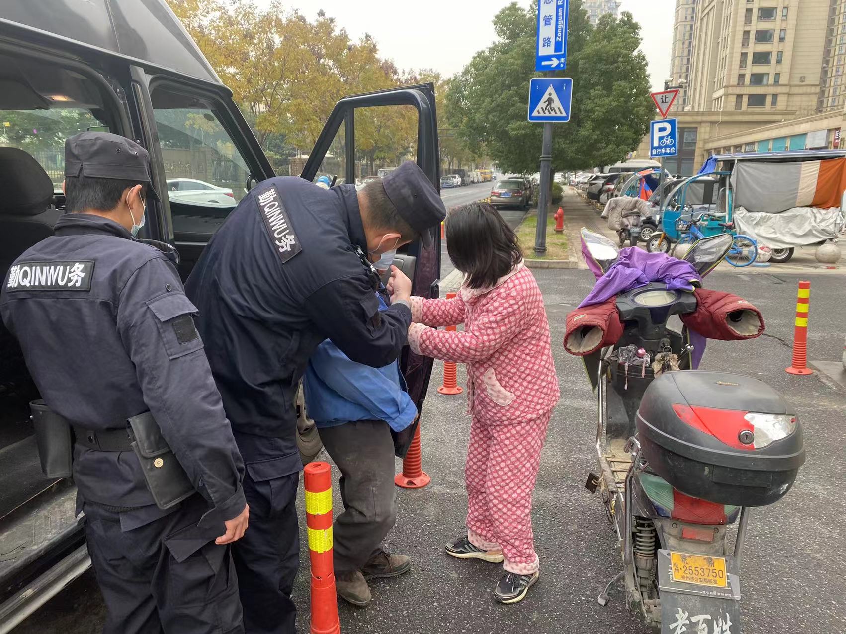 當日13:40,公司員工姜航和凌紹凱駕駛巡邏車(chē)在良渚新城好運街與小洋壩路附近巡邏時(shí),發(fā)現一位老人摔倒在地,一輛電瓶車(chē)壓在老人的身上。