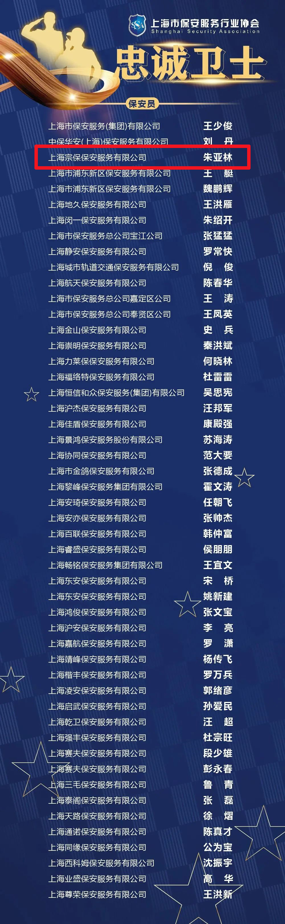 1月17日,上海市保安服務(wù)行業(yè)協(xié)會(huì )公布了“忠誠衛士”評選結果,宗保公司1個(gè)保安隊和1名員工分獲殊榮。