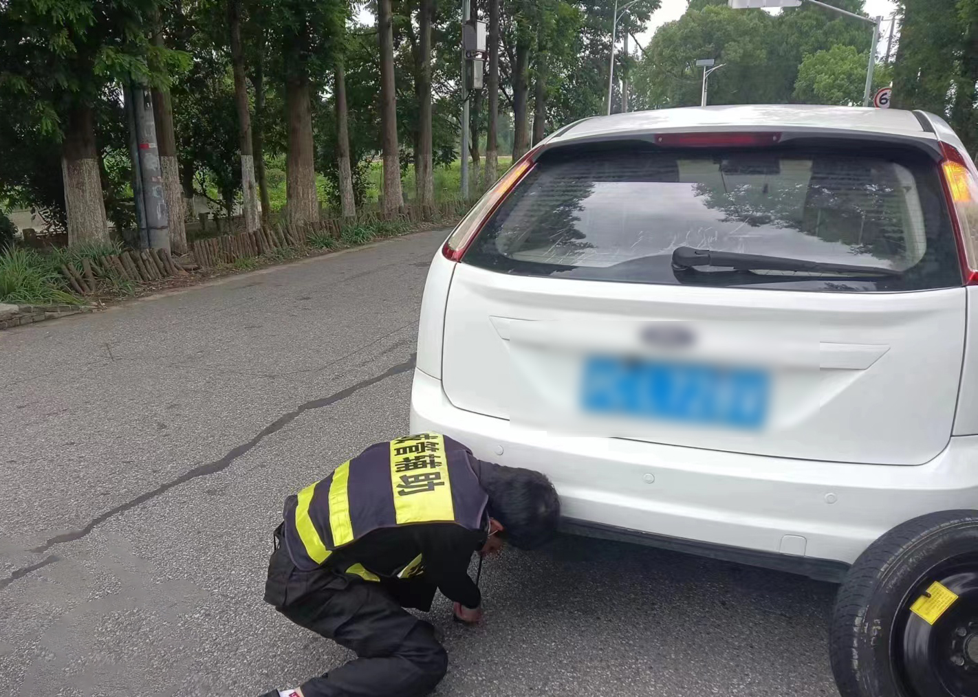 6月26日,宗保公司駐浦東新區周浦市容項目員工幫助女士更換轎車(chē)輪胎。