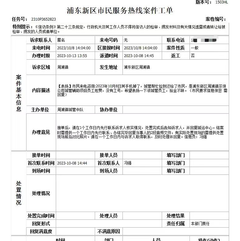 10月8日13:30,宗保公司駐浦東新區周浦市容項目員工賈勝輝在周秀路巡查時(shí),撿到一部華為手機。因手機設有鎖屏密碼,一時(shí)無(wú)法聯(lián)系到失主,賈勝輝報告班組長(cháng)后便在原地等待失主。大約過(guò)了10多分鐘,一男子打來(lái)電話(huà)自稱(chēng)是失主,賈勝輝了解情況后,就與他約好在周浦鎮城管執法中隊碰面。很快,男子趕到約定地點(diǎn),成功地解開(kāi)了鎖屏密碼。賈勝輝確認男子是失主后,將手機交還給了他。男子拿著(zhù)手機連連向賈勝輝道謝,并特意撥打了12345上海市民熱線(xiàn),贊揚宗保公司駐周浦市容項目員工賈勝輝拾金不昧的行為。