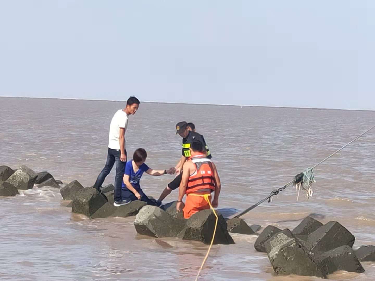 “快看那邊,水里有人?!?0月2日下午14:10,宗保特保隊員在海堤上巡查時(shí),發(fā)現在海水中的礁石上困著(zhù)一對青年男女。當時(shí),海水不斷上漲,很快就要淹沒(méi)礁石,兩名游客緊張得瑟瑟發(fā)抖,情況危急。