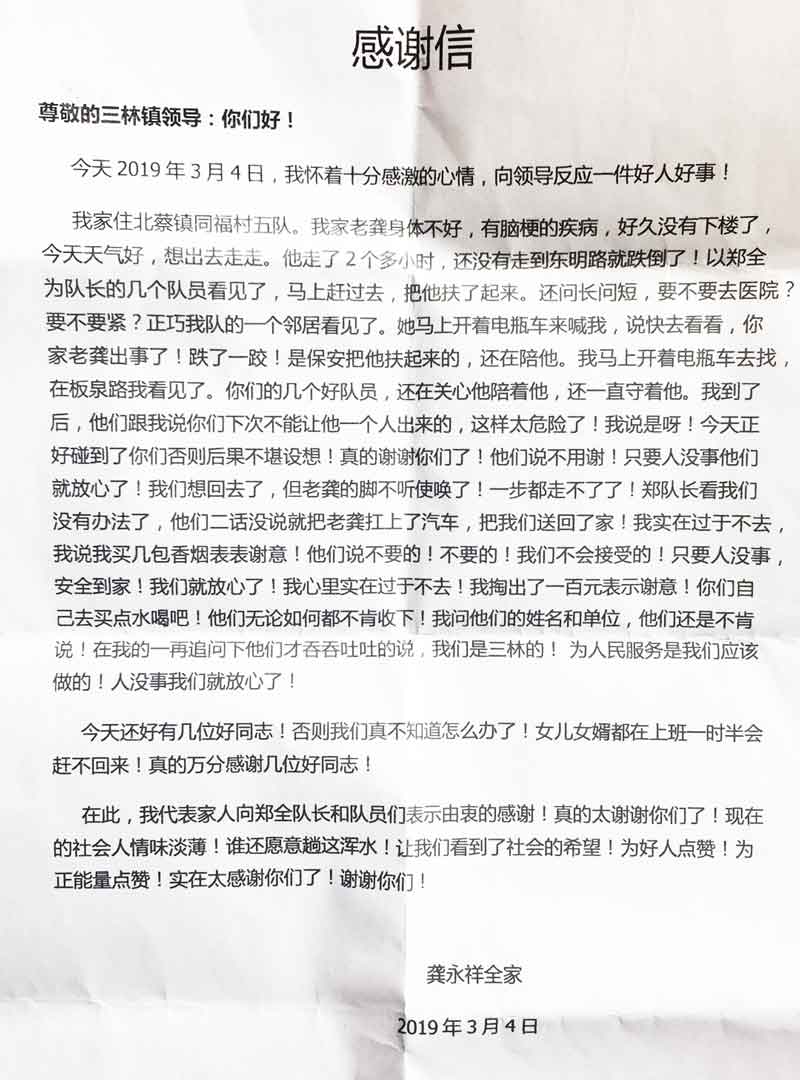 2019年3月5日早上10:00,三林城管市容中心收到一封感謝信,信件內容是感謝宗保駐三林市容項目隊員熱心幫助倒地老人。