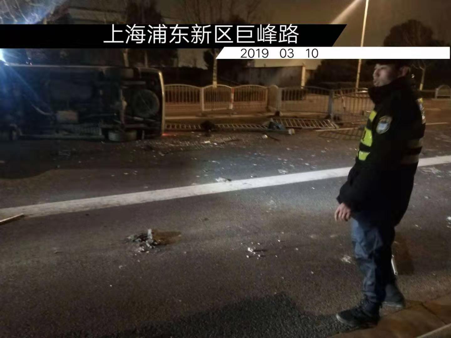 當晚19:20,宗保駐金橋輔警項目隊員張祿祿、高景在申江路地鐵站附近巡邏時(shí),突然聽(tīng)到一聲巨響,兩人聞聲趕去,原來(lái)發(fā)生了一起交通事故。一輛小型面包車(chē)撞在馬路中間的護欄上,發(fā)生了側翻,導致護欄大面積損壞。車(chē)內只有駕駛員一人,詢(xún)問(wèn)駕駛員,表示無(wú)大礙。