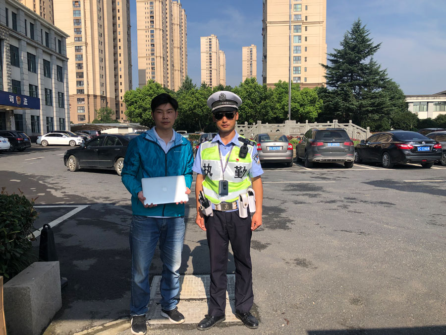 于是,張龍把背包就近放置在閑林街道辦事處保安室門(mén)衛處,并向工作人員說(shuō)明情況,然后繼續執勤等待失主回來(lái)找尋。大概在8:30早高峰即將換崗的時(shí)候,一位穿藍色外套的男士急匆匆地趕過(guò)來(lái),詢(xún)問(wèn)張龍和李丹是否撿到一個(gè)裝有蘋(píng)果電腦的包。張龍將失主帶到門(mén)衛處認領(lǐng),經(jīng)核對穿藍色外套的男士確實(shí)是失主本人后,就把包內電腦及其他貴重物品原封不動(dòng)地交還了失主。