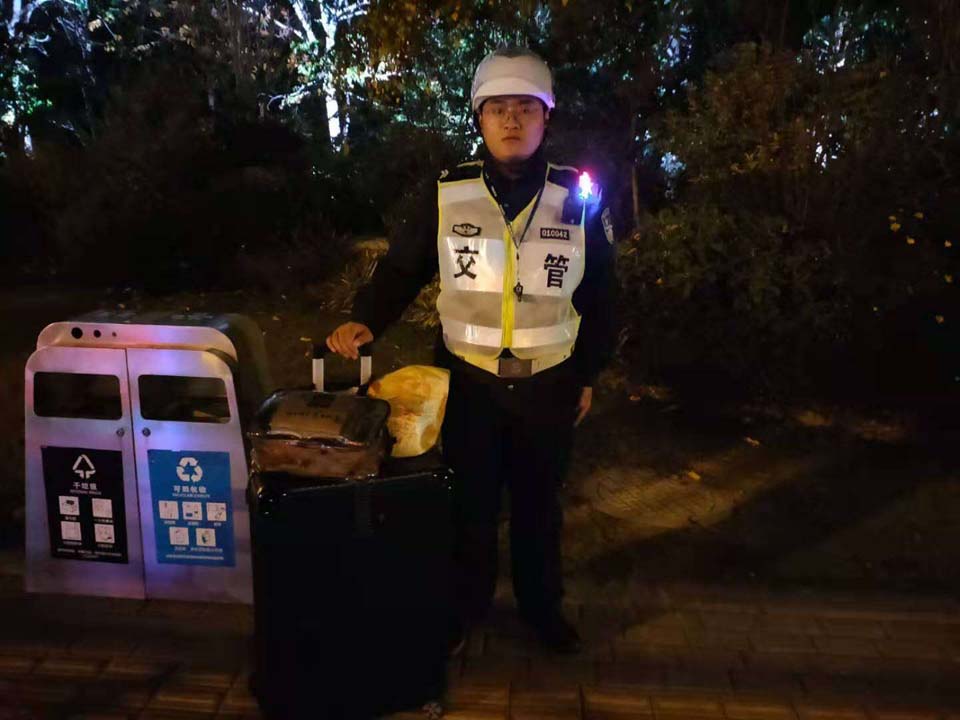 當天19:25,宋金峰在滬青平七莘路路口東北角巡邏時(shí)撿到一個(gè)行李箱,考慮到失主丟了行李箱一定很著(zhù)急,便在原地等待。