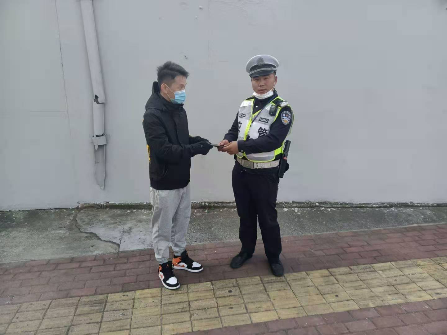 當日16:45左右,王中坦在滬閔路報春路口值勤時(shí)撿到一部手機,因手機設有開(kāi)機密碼,無(wú)法獲取失主的聯(lián)系方式,便在路口邊執勤,邊等待失主聯(lián)系。